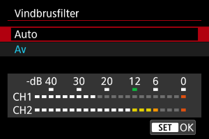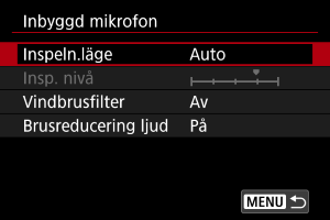 Tillgängligt om du använder den inbyggda mikrofonen eller externa mikrofoner anslutna till ett flerfunktionsfäste, som är kompatibla med vindbrusfilter.