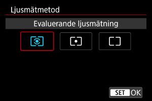 Metoder för att mäta motivets ljusstyrka (ljusmätmetoder) tillhandahålls. Normalt rekommenderas evaluerande ljusmätning. Evaluerande ljusmätning ställs in automatiskt i baszonens lägen (utom i läget :