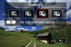 - Om du har valt någon annan inställning än [Av] och försöker uppnå en mörkare exponering med hjälp av exponeringskompensation eller blixtexponeringskompensation kan bilden bli ljus ändå. Ställ in den här funktionen till [Av] om du vill uppnå en mörkare exponering.
