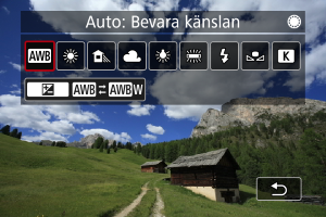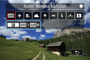 Vitbalans (VB) är till för att få vita områden att se vita ut. I normala fall får du rätt vitbalans med inställningen Auto [] (Bevara känslan) eller [