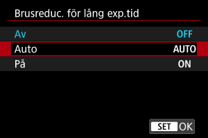 För bilder med exponeringar på en sekund eller längre utförs brusreducering automatiskt, om brus som är typiskt för långa exponeringar upptäcks. Inställningen är effektiv nog i de flesta fall.