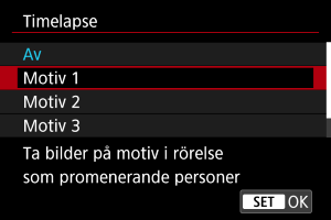 - Se Prestandakrav på kort (filminspelning) [skriv/läshastighet] för mer information om kort som kan spela in timelapse-filmer.