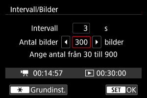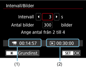 Indikerar tiden som krävs för att ta antalet bilder med det angivna intervallet. Om tiden överskrider 24 timmar visas ”*** dagar”.