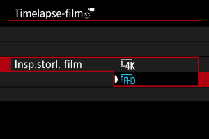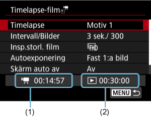 Indikerar filminspelningstid (tid som krävs för att spela upp filmen) när du ska skapa timelapse-filmen i L 4K-film eller Full HD-film från stillbilderna som tagits under de angivna intervallen.
