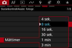Du kan välja hur länge mättimern pågår (vilket avgör exponeringsvärdets längd) efter att den utlöses automatiskt av en handling, till exempel att avtryckaren trycks ner halvvägs.