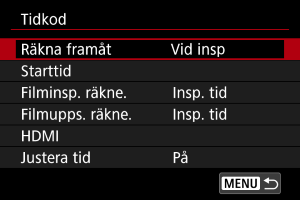 Tidkoden fortskrider endast under filminspelning. Tidkoder i varje inspelad videofil fortsätter från den sista tidkoden i den föregående filen.