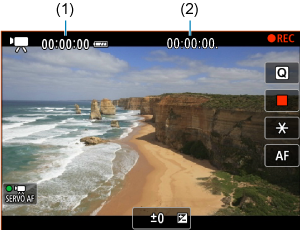 Under inspelningens vänteläge visas den tillgängliga inspelningstiden. Under inspelningen visas tiden som har gått sedan filminspelningen började (1).
