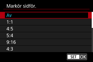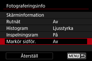 Om du ändrar sidförhållandet medan den inspelade filmen redigeras, kan du visa markörer för förhållande på filminspelningsskärmen (under standby och inspelning) för att vara medveten om den slutliga bildvinkeln efter redigering.