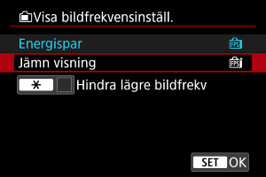 Du kan ställa in bildfrekvensen för skärmen vid stillbildsfotografering. Välj om du vill spara på batteriet eller använda en hög bildfrekvens vid visning.