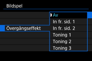 - Ställ in inställningarna [Tidsintervall], [Repetera] (upprepad bild-/filmvisning) och [Övergångseffekt] (effekt vid bildbyte) för stillbilderna.