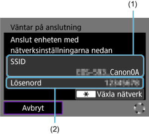 - Kontrollera det SSID (1) och Lösenord som (2) visas på videokamerans skärm.