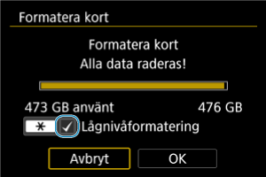 - Vid lågnivåformatering kan du avbryta formateringen genom att välja [Avbryt]. Den vanliga formateringen är redan klar och du kan använda kortet som vanligt.