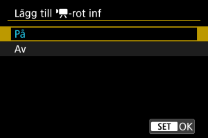 För filmscener som spelas in med videokameran vertikalt kan orienteringsinformation som indikerar vilken sida som är upp läggas till automatiskt för att aktivera bild-/filmvisning i samma orientering på smartphones eller andra enheter.
