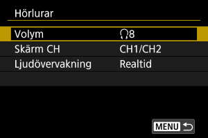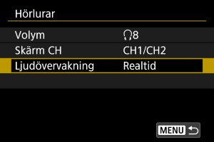 Du kan välja ljudet under filminspelning som används för hörlursutmatning. Konfigurera för att reducera brus vid ljudinspelning [Brusreducering ljud] ().