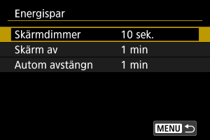 - [Skärmdimmer] och [Skärm av] tillämpas medan inspelningsskärmen visas. Dessa inställningar gäller inte under menyvisning eller bildvisning.