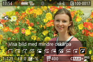 - Inga ikoner eller detekteringsramar som indikerar mängden oskärpa visas vid visning av bilder som har tagits som RAW+JPEG- eller RAW+HEIF eftersom RAW-bilder används för denna visning. Välj kortet som innehåller JPEG eller HEIF i [