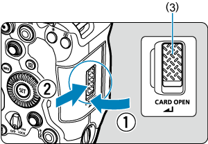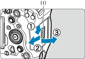 - Med låsreglaget för minneskortsluckan (1) skjutet mot frigöringssidan ska du dra minneskortsluckan mot dig för att öppna den.