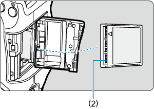 - Sätt in den öppna sidan av kortet (2) i kortplatsen med kortetiketten vänd mot dig. Att sätt i kort på fel sätta kan skada kameran.