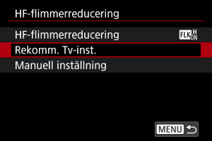 Kameran detektera ljuskällor med 50,0–8193,7 Hz och visar en lämplig slutartid för fotografering under ljuskällor som flimrar med höga frekvenser. Du kan sedan byta till den angivna slutartiden.
