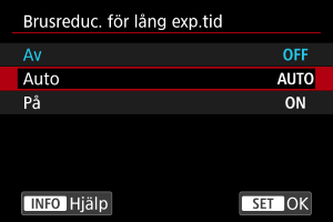 För bilder med exponeringar på en sekund eller längre utförs brusreducering automatiskt, om brus som är typiskt för långa exponeringar upptäcks. Inställningen är effektiv nog i de flesta fall.