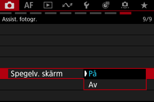 En spegelbild kan visas när du fotograferar med skärmen roterad mot motivet (mot kamerans framsida).