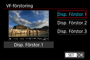 Du kan välja visningsförstoringen för skärmen i sökaren. Du kan reducera förstoringen om kanterna på skärmen är svåra att se, då du får en bättre överblick.