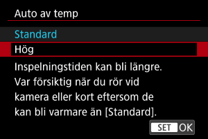 Du kan ställa in den maximala temperaturen på kamerahuset vid vilken kameran stängs av automatiskt. Om du ställer in den här nivån till ett högre värde än standardtemperaturen kan du förlänga den tillgängliga inspelningstiden genom att eliminera vissa driftsbegränsningar.