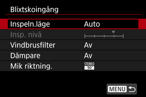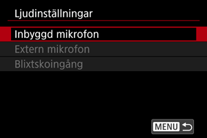 Konfigurera mikrofoner för ljudinspelning med dessa inställningar. Se även mikrofonens användarhandbok om du använder mikrofoner som är externa eller designade för ett flerfunktionsfäste.