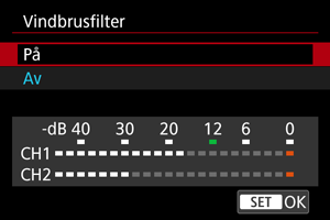 Ställ in på [På] för att reducera vindbrus automatiskt när det blåser utomhus. När vindbrusfiltret aktiveras minskas också en del låga basljud.