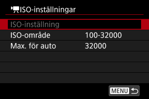 Du kan ställa in det manuella intervallet för ISO-talet (minimum och maximum). Utvidgat ISO kan också konfigureras.