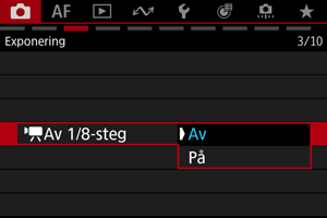 Välj [På] för att ändra bländarens ökning med från 1/3 steg (eller 1/2 steg) till 1/8 steg.