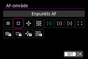 Fokuserar med en AF-punkt [] och AF-området som visas här med blått. Effektivt för motiv i rörelse som är svåra att spåra med enpunkts AF.