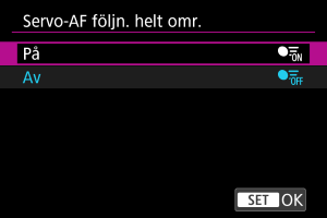 : Servo-AF följn. helt omr.] till [På] eller [Av] genom att trycka på knappen