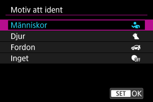 När avtryckaren trycks ned halvvägs för val av motiv kan du välja följande motiv. I scener utan relevanta motiv spårar kameran andra motiv oavsett inställningen i [