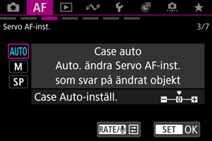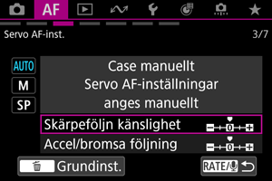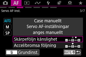 Du kan ställa in följningsparametrar för Servo AF (motivets skärpeföljn känslighet och accelerations-/retardationsföljning) beroende på motivet och fotograferingssituationen.