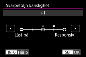 Kameran försöker fortsätta fokusera på motivet även om ett icke-motiv förflyttar sig över AF-punkterna eller om motivet kommer bort från AF-punkterna. Inställningen -2 gör att kameran följer målmotivet längre än med inställningen -1.
