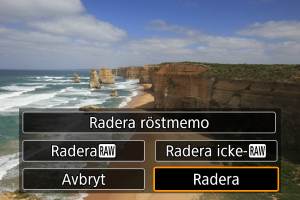 - För bilder med röstmemon kan du välja [Radera röstmemo] för att även radera endast röstmemon under bildvisning.