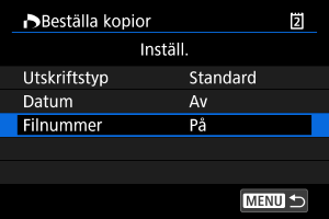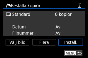Du kan göra utskriftsinställningar som utskriftstyp, inkopiering av datum och filnummer osv. Utskriftsinställningarna tillämpas på alla bilder som du beställer kopior av. (De kan inte ställas in individuellt för varje bild.)