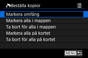 Om du väljer [Ta bort för alla på kortet] raderas beställningen av kopior för samtliga bilder på kortet.