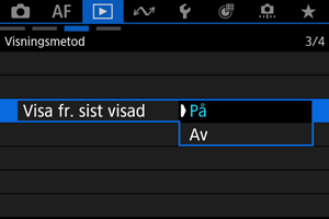 ]: Bildvisningen återupptas från den sist visade bilden (förutom om du just har avslutat fotograferingen).