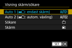 Du kan ange att använda skärmen eller sökaren för visning för att undvika att aktivera sökarsensorn av misstag när skärmen är öppen.