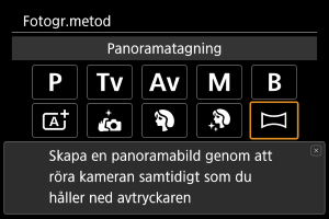 Panoramabilden skapas genom att kombinera bilder som tas i serietagning medan du flyttar kameran i en riktning och samtidigt håller ned avtryckaren helt.