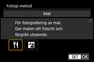 har tryckts ned kan du ställa in mot [Varm] (rött) för att öka den rödaktiga nyansen på mat eller mot [Kall] (blått) för att reducera en överdriven röd nyans.