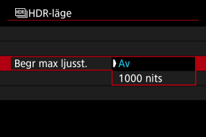 - Med [Av] är maximal ljusstyrka inte begränsad. Rekommenderas när du kommer att granska bilder på en bildskärm som stöder ljusstyrkor över 1000 nits.