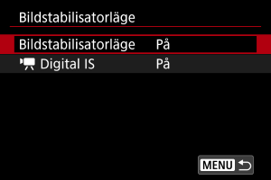 Aktiverar bildstabilisering med IS på objektivet. Visas när IS-objektiv utan en IS-omkopplare används. Visas inte för andra objektiv.