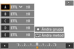 för att välja en blixtgrupp (A–E) att konfigurera.