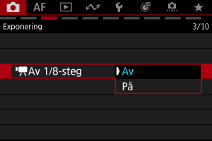 Bländarvärden kan ställas in i steg om 1/8 steg för filminspelning med RF-objektiv. Tillgängligt med inspelningsmetoderna [], [], [] eller [].