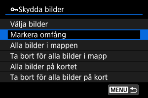 - Välj [Ta bort för alla bilder i mapp] eller [Ta bort för alla bilder på kort] för att avbryta skyddet.
