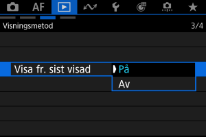 ]: Bildvisningen återupptas från den sist visade bilden (förutom om du just har avslutat fotograferingen).