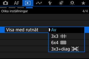 Du kan visa ett rutnät över stillbilder som visas som enbildsvisning på visningsskärmen. Funktionen är praktisk om du vill kontrollera bildens vertikala och horisontella lutning samt komposition.